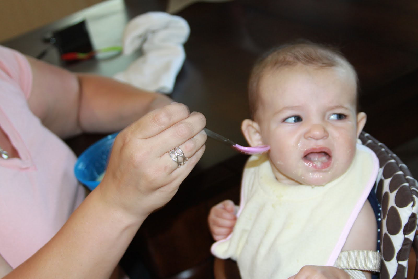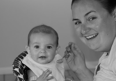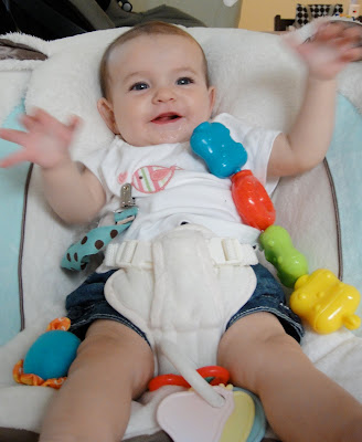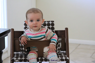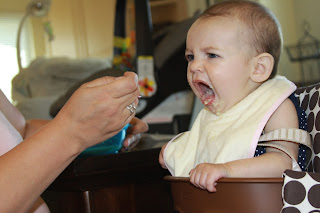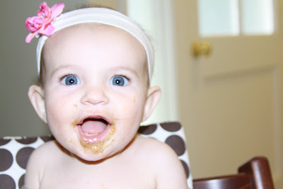 We have adventured into solids just in the past 2 weeks now. We decided to wait until she was 6 months to start, as she is primarily breastfed.  It did not start out so well, but now it is going great.  Bailey did not like the food at first, and we had to stop briefly due to some tummy issues, but now everything is going well in the solids department as well as usual in the nursing department.  Bailey is now eating fabulously and enjoying a little bit of all the purees I made her along with a little cereal.  We are still nursing every 2-3 hours as she demands and using the solids as extra, just to introduce her to them.  Our baby is growing up too quickly!  I will go into more detail in the next post.  Here are some pictures of Bailey enjoying different things, more to come soon.  {Oh yes, and I will be posting the photos we took of her really despising disliking solids on the first try.  She has come a long way!}