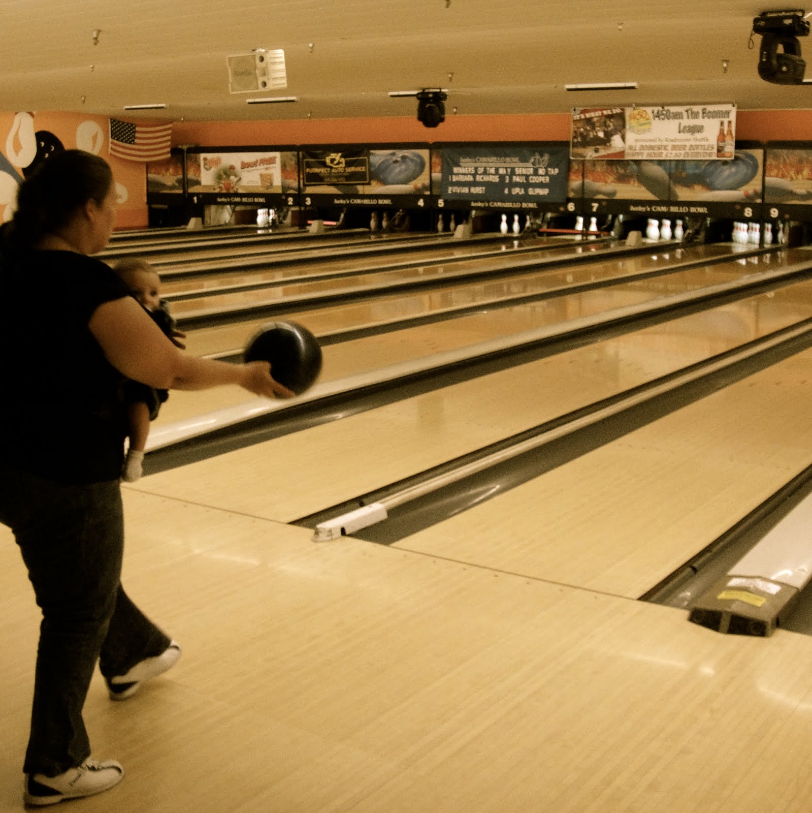 Yes, we are baby wearing while bowling, this is how we "roll".